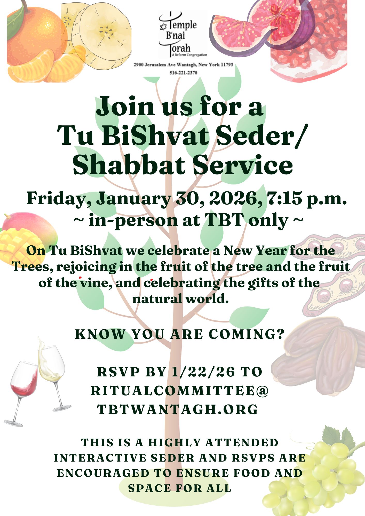 • 01/30/2026: Tu BiShvat Seder and Erev Shabbat Service