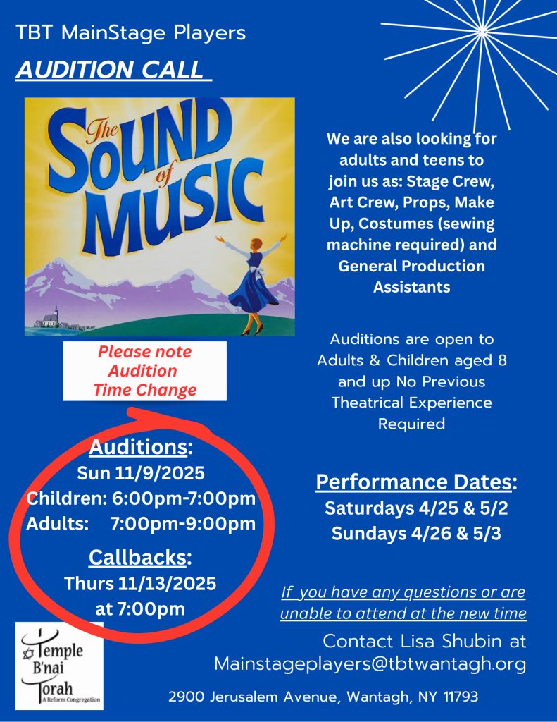 tbtwebsite October 13, 2025 Uncategorized Upcoming Events 11/09/2025: TBT Players “Sound of Music” Auditions